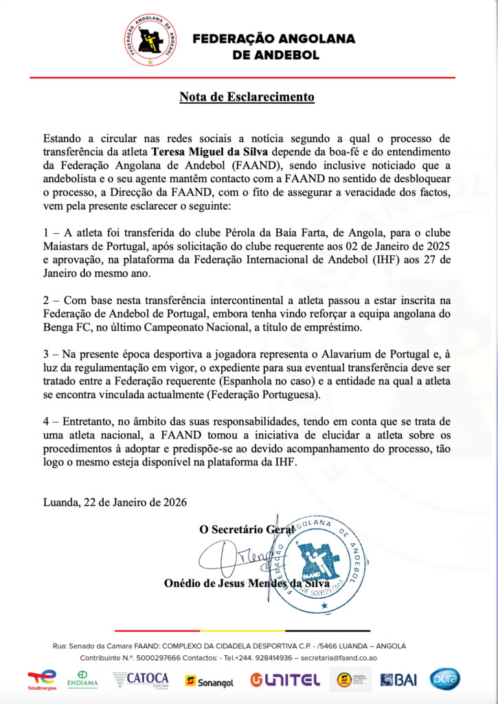 da Federação Angolana de Andebol (FAAND), sendo inclusive noticiado que a